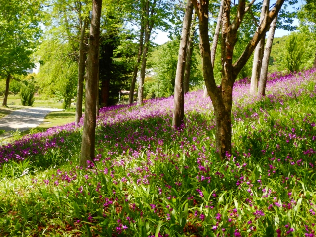 ポプラの丘の隣、水の棚田周辺一帯でシランがきれいに咲いています。赤紫が本当にきれいなんですが、写真でそのきれいさが伝えられないのがとてももどかしい・・・見に来てください。
