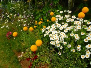 よく訊かれるお花ですが、写真1枚目の球状の花はクラスペディア、3枚目はアマ、4枚目は春菊のお花です。おいしい春菊は花もかわいい。