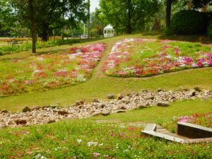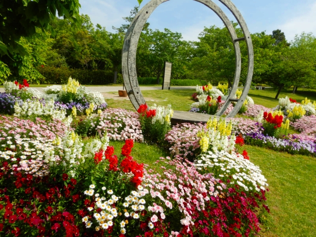 大地の虹北花壇が今とってもきれいです!最近はお花を『いかに映える写真にするか』としゃがんで撮ることが多い昨今(多分この公園のSNSもそんなのが多いかも)、ひざが悪い人が立ったまま撮ってもきれいに写せる花壇なのです。ですので、ゆっくりと散策なさるご年齢の方にご好評いただいております。
