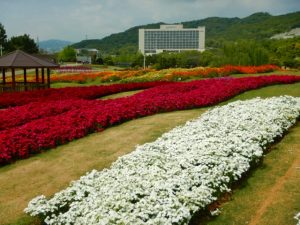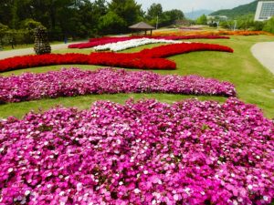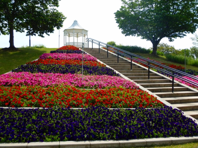 移ろいの庭の花壇はお花の形をしており、でっかい花びらや茎をペチュニアで塗りつぶしている感じです。階段花壇も鮮やかで、写真撮影にはおススメですよ。