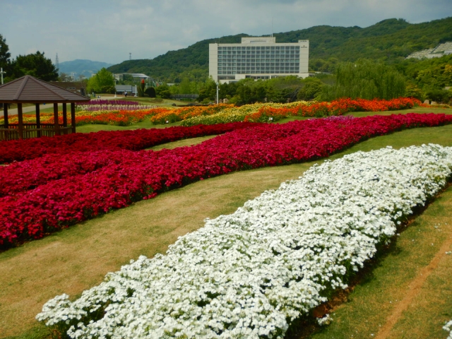 写真一・二枚目は海のテラスの花壇、三・四枚目はポプラの丘上段にあるフォトリング花壇です。花が満開、とてもきれいな状態です。