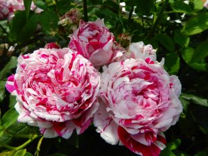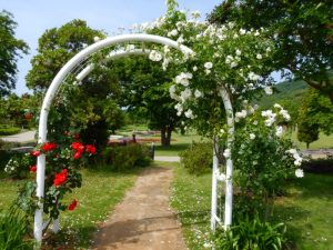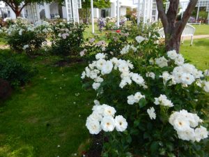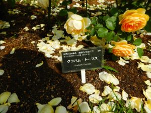 移ろいの庭の一角で、現在バラがきれいに咲いています。小規模ではありますが、殿堂入りのバラ(世界バラ会連合が3年に1回開催する世界バラ会議において選出したバラ)を中心に、いろいろな品種のバラを植えています。