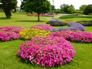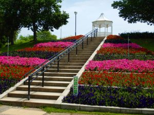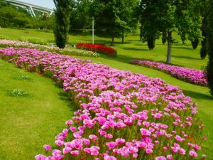 移ろいの庭の花壇はお花の形をしており、でっかい花びらや茎をペチュニアで塗りつぶしている感じです。階段花壇も鮮やかで、写真撮影にはおススメですよ。6月になると植え替えが始まりますので、ご覧になりたい方はお早めにどうぞ。