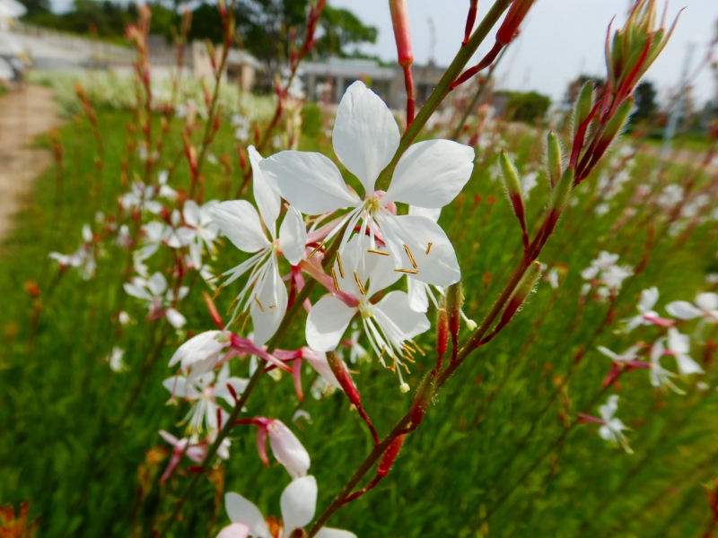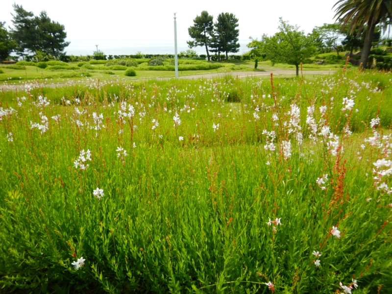 海岸口ゲートそばの一帯で、海風で爽やかに揺れるガウラが咲き始めました。これから花数がガーッと増えていきます。小規模チョコッとずつですが、園内の他の場所でも咲いています。
