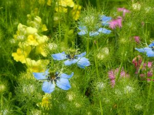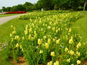 先週からキンギョソウがきれいに咲いていますが、それと一緒に植えてあるカワラナデシコやニゲラが咲いてきています。黄色一色からだんだん華やかになっていきますよ。その後には同じ花壇でユリが咲きますのでお楽しみに。