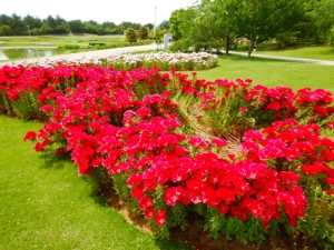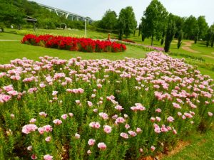ゴデチアが一気に咲きました。同じ高さで花が咲き揃っているので花壇が一色に染まり、近くで見ても遠くからでもきれいです。残念なことに一部の花壇は水分が多かったのか、根元から倒れちゃっています。