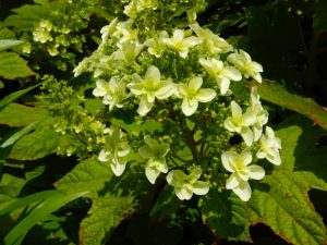 アジサイよりも一足早く、カシワバアジサイが咲き始めました。咲き始めは円錐状の花穂が、空に向かってツンツン立っています。