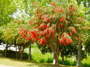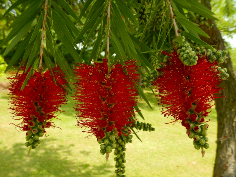 ブラシノキに、瓶を洗うブラシに似ている花がブラブラ下がり始めました。咲きたての今なら、本当にブラシが洗えそうなくらいガッシリ丈夫な感じですよ。興味があれば触ってみてくださいね。