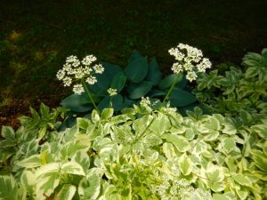 先週はゴロゴロ咲いていたシャクヤクを紹介しましたが、ここ一週間に2回来た豪雨と暴風で、咲いていた花は一気に散りました。とはいえまだつぼみがありますので、もう少し楽しめそうです。その周りでは他の花も数種類咲いています。写真一枚目から、ミツバシモツケ、ヒューケラ、エゴポディウム、シャクヤクです。
