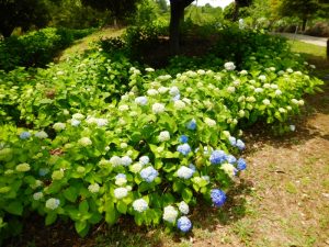 6月以降に本格的にアジサイのシーズンが始まりますが、せせらぎ広場と空のテラスの一部で、一足早く四季咲きアジサイと普通のアジサイが咲き始めました。真っ白大輪で人気のアナベルはまだ小さいつぼみですので、開花はさらにその後になります。