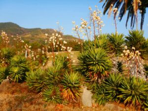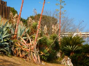 花の無い花茎が増えていますが、まだつぼみも残ってたりして息が長いです。2~4メートルもの高さがあるため普通なら目立つはず!ですが、でっかい植物のそばに植えられているという園内のポジショニングで割を食っており、全然大きく見えません(写真一・二枚目は海岸口ゲートそば、三枚目は空のテラス下)。