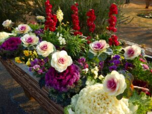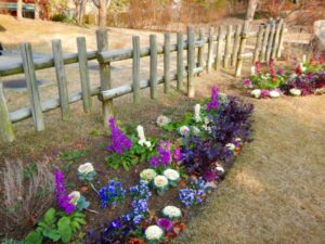 花の丘道は、東浦口ゲートもしくは連絡口ゲートとポプラの丘を結ぶ園路です。その園路の両脇には小ぶりの花壇が30以上あり、1年を通じて何かしらのお花を楽しめるようにデザインしています。とはいえ花が枯れがちな真夏や、咲く花自体が少ない冬は難しい!そこで今年はハボタンを多めに盛り込み、カラフルに見えるようにしてみました。淡路口ゲートから入場のお客様には遠いですが、もしも寒さが厳しくない日であれば、是非足を運んでいただけたら幸いです。なお、ハボタンも「緑・花クイズラリー」の問題となっていますので、是非チャレンジください。
