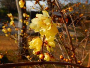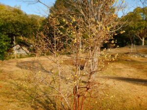 ロウバイが咲き始めています。植えてある数は少なく、花の丘道周辺に多分8本くらいで、そのうちちゃんと咲くのは3~4本のみ。