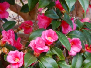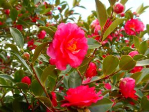 園内あちこちチョコッとずつ、ツバキ類が咲いています。写真一・二枚目は移ろいの庭の高台に咲くカンツバキ、写真三・四枚目は花の谷のワビスケです。他のツバキも花の谷周辺で幾種類か咲いてますが、大きい木にちょっとずつの開花のため、近くに寄らないと気付きにくいです。