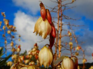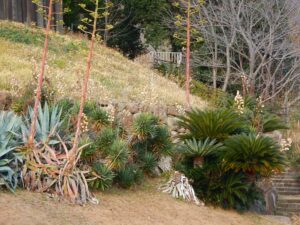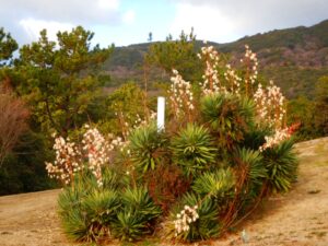 花が落ちて茎だけになった株が先週増えてきていたので、今週はもう終わったかな~と海のテラスから眺めてみたら、まだ咲いてました。息が長い。写真では全然大きく見えませんが、2~4メートルもの高さがあります(写真一・二枚目は海岸口ゲートそば、三枚目は空のテラス下)。