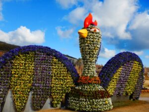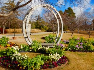 ポプラの丘のてっぺん辺りにあるフォトリング花壇。パンジー、ストック、キンギョソウ、そしてナノハナが咲いています。この花壇の真横では四季咲丁字桜も秋から継続して咲いています。