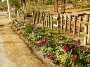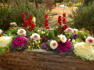 花の丘道は、東浦口ゲートもしくは連絡口ゲートとポプラの丘を結ぶ園路です。その園路の両脇には小ぶりの花壇が30以上あり、1年を通じて何かしらのお花を楽しめるようにデザインしています。今年はハボタンを多めに盛り込み、例年よりカラフルに見えるかも。ハボタンも「緑・花クイズラリー」の問題となっていますので、是非チャレンジください。