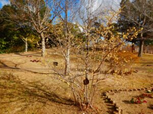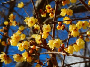 冬の花と言って思い浮かぶ、数少ない花のうちの1つ、ロウバイ。当公園の植栽数は少なく、花の丘道周辺に多分8本くらいで、そのうちちゃんと咲くのは3~4本のみ(今後増やす計画あり)。