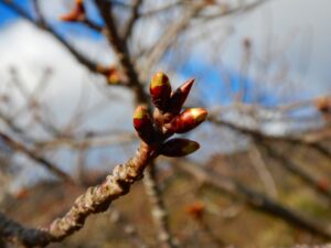 ミモザと同じ時期に見ごろを迎える河津桜のつぼみの様子も載せておきますね。ちょっとずつ膨らんできています。