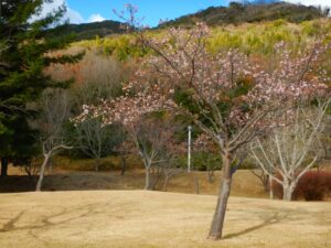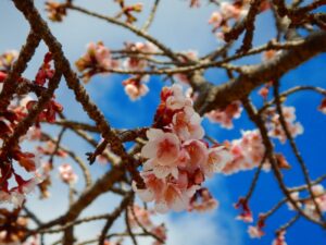 2本しかありませんが、極寒の時期に毎年楽しませてくれる桜です。写真1枚目右寄りの木が現在見ごろで、写真中央奥に写っているもう1本は、チラホラ開花といった程度です。