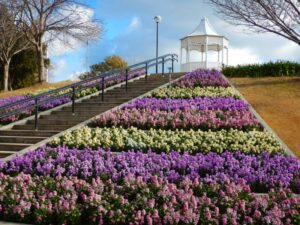 木々の葉っぱが落葉し、園内の見通しがよくなり、立体花壇が遠くから認識しやすくなっています。咲き終わった花の除去が終わったばかりなので、色が若干薄めです。甘い香りが楽しめますので、近くに寄ってみてください。