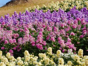 お花の少ない冬に、頑張って咲いてくれるストック。今年は薄ピンク、薄紫、卵色と、淡い色合いの3色です。近くを歩くと甘い香りを感じられますよ。