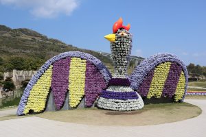 春はビオラ、夏はベゴニアなど季節のお花で彩られた、大きな花火鳥やタコの立体花壇は迫力満点!小人になった気分で隣に立ってみてね。