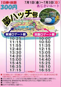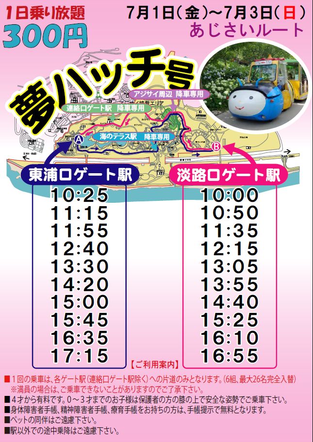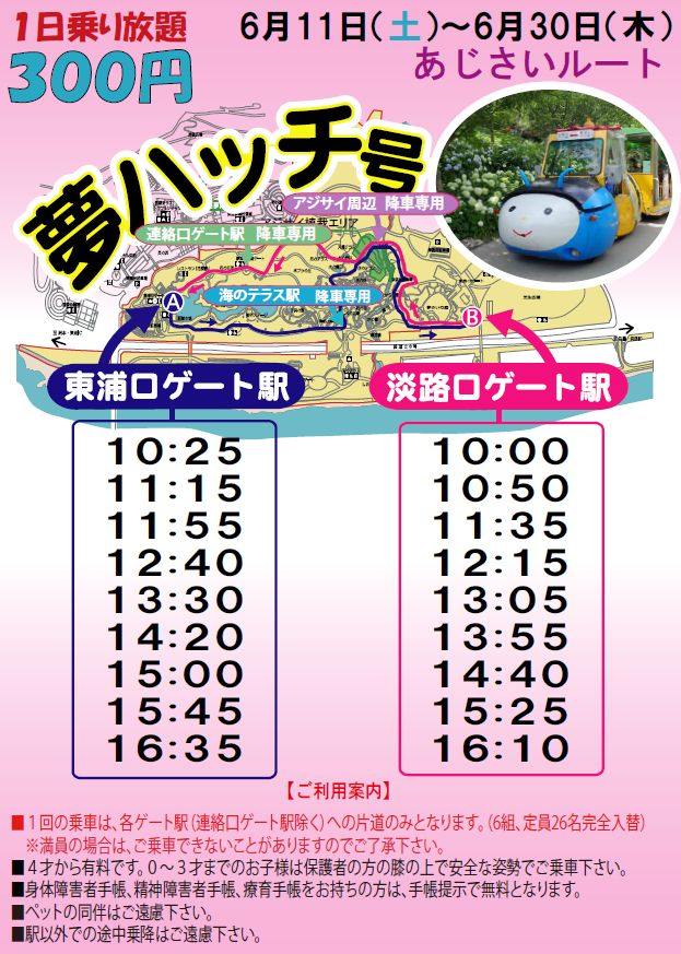 6月11日(土)から7月3日(日)の期間、夢ハッチ号は、見頃のアジサイ周辺を通る「アジサイ特別ルート」で運行いたします。