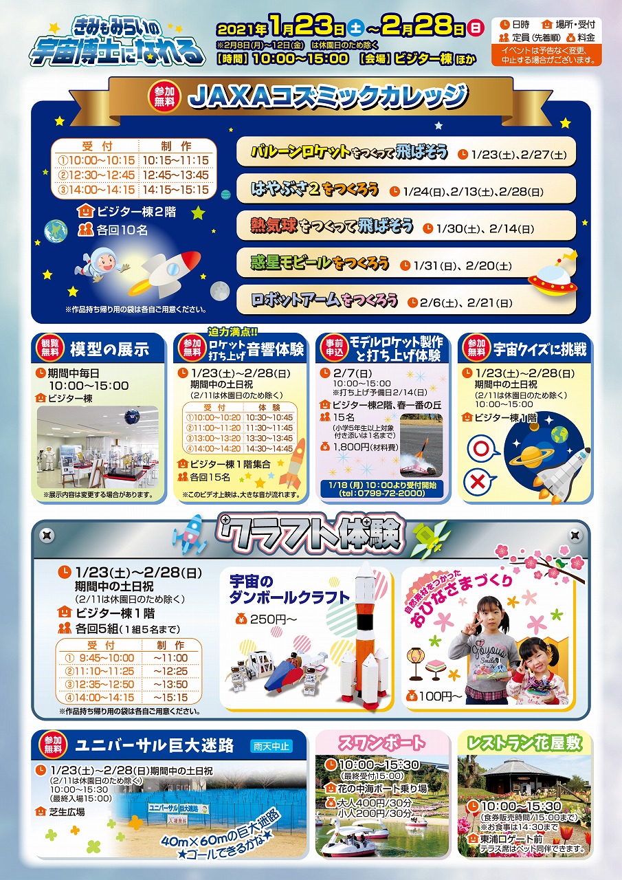 JAXA協力のもと、「はやぶさ2」の模型展示をはじめ、期間中の土日祝には、「JAXAコズミックカレッジ」を開催。