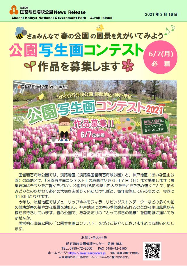 国営明石海峡公園 淡路地区(淡路島国営明石海峡公園)と神戸地区(あいな里山公園)の春の美しい花や心なごむ情景をテーマに描いた作品を募集します。